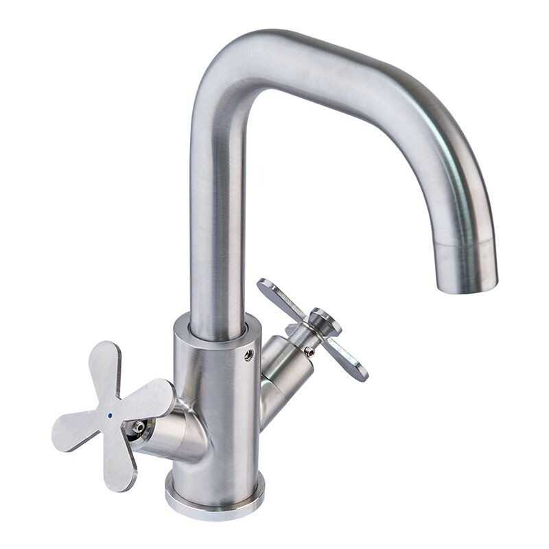 Двохвентильний змішувач для умивальника Dante GTA-001 з нержавіючої сталі виконаний у традиційному для цього типу сантехнічних пристроїв дизайні. Вилив поворотний, що дозволяє при необхідності прибрати його вбік.
