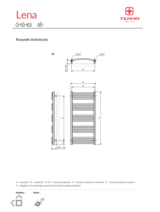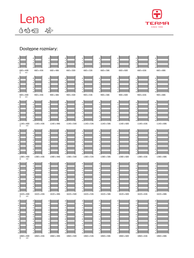 Рушникосушка Terma Lena – бюджетна сушка для рушників, одна з варіацій на тему класичної драбинки. Прямокутні вертикальні колектори і круглі горизонтальні опуклі перемички, розташовані групами: причому, незалежно від моделі Terma Lena, у групі — чотири перемички. Рушникосушка Terma Lena купити і підібрати можна у ванну кімнату будь-якого розміру — Terma Lena випускається в тридцяти типорозмірах